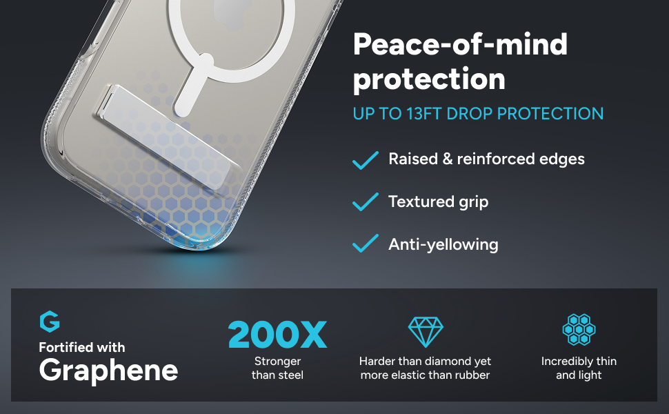 Crystal Palace™ Snap with Kickstand elegantly stands up to the task, balancing clarity with exceptional strength. This case covers every detail so you can focus on enjoying the phone you love. It starts with an incredible 13 feet of drop protection engineered into the case's structure, incorporating ultra-resilient graphene that reinforces without adding bulk. And we've added a kickstand and camera control button for ultimate usability. Crystal Palace™ Snap with Kickstand has anti-yellowing technology and anti-scratch finish to keep your case (and phone) looking pristine, and of course, it's built MagSafe compatible and works flawlessly with wireless chargers. It's the perfect sidekick — fitting in seamlessly while handling the heavy lifting.